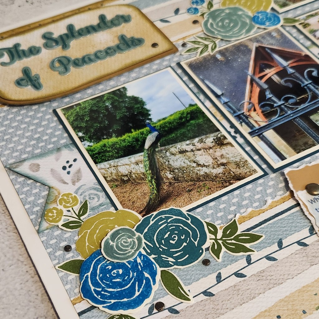 I had the most magical time creating my latest scrapbook page, “The Splendor of Peacocks,” inspired by our enchanting visit to the château and its beautiful feathered residents. Thor, the most striking peacock, may have been shy, but his breathtaking plumage made quite the impression!