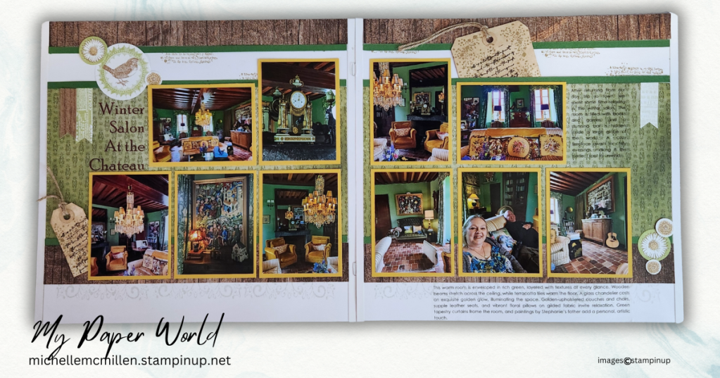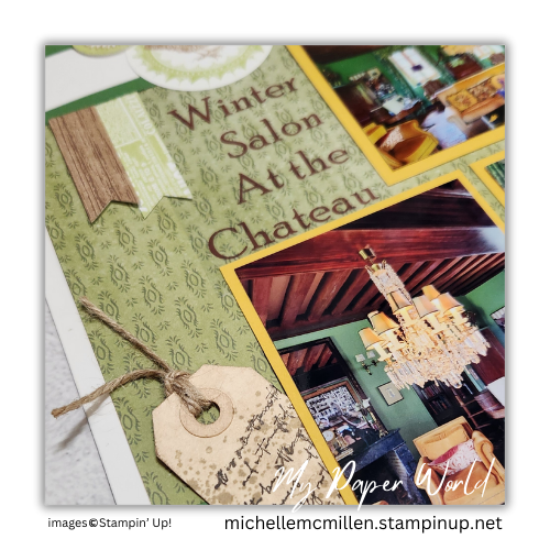 Inspired by the rich wood tones and the vibrant colors of the salon, I decided to create a layout using Country Woods paper from Stampin’ Up! and a mix-in paper from my Close To My Heart stash. I used stickers from the CTMH Skylark sticker sheet and stamped along the bottom with the Tile Technique stamp set, using CTMH Linen ink. For the border at the top, I added a touch of the Elements of Text stamp. Tags with more Elements of Text, stamped in SU Early Espresso, were added for extra texture. The journaling at the bottom was typed on a clear Avery Shipping label and printed, completing the nostalgic feel of the layout.