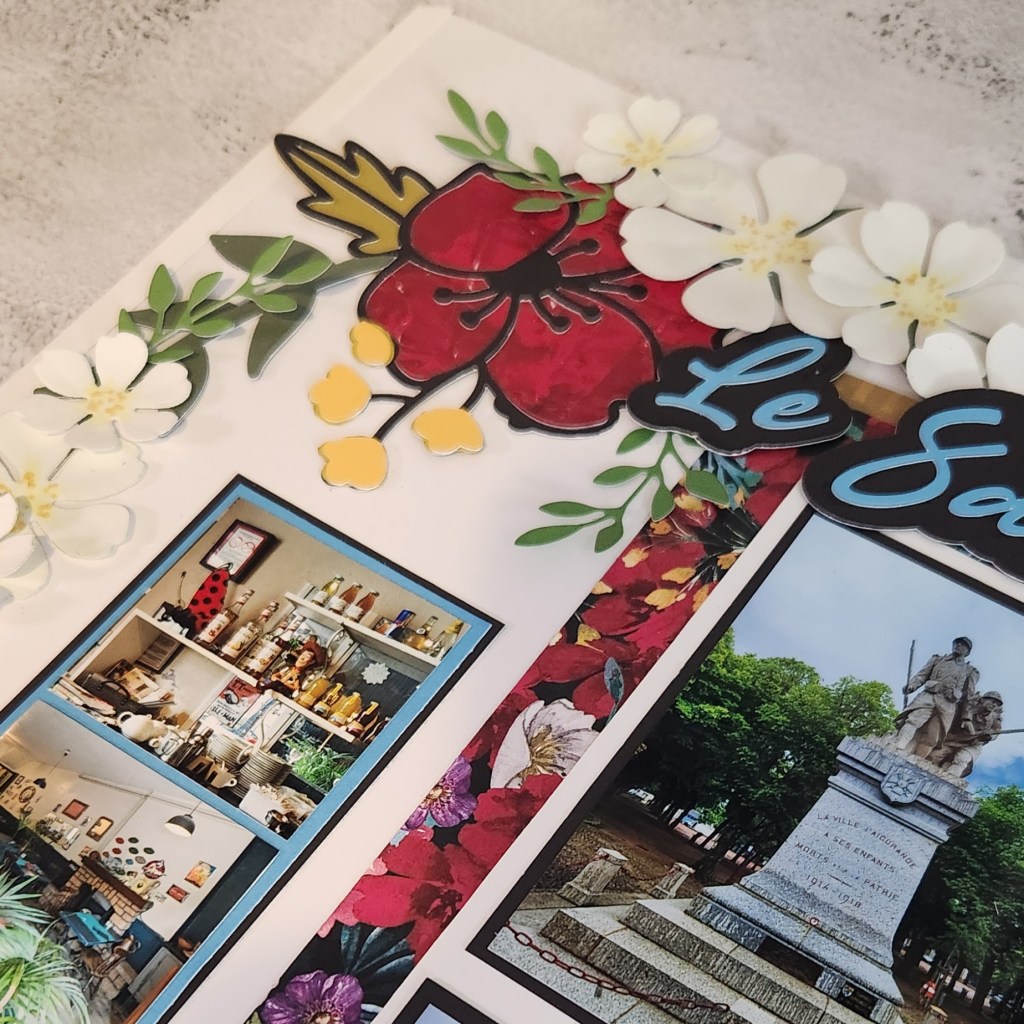 To make the design pop, I highlighted the turquoise hues from our photos using Stampin’ Up! Azure Afternoon—it brought such a fresh and elegant touch! The circle wreath and title were cut with my Cricut, and I layered die-cut flowers, leaves, and sprigs for beautiful dimensional clusters.