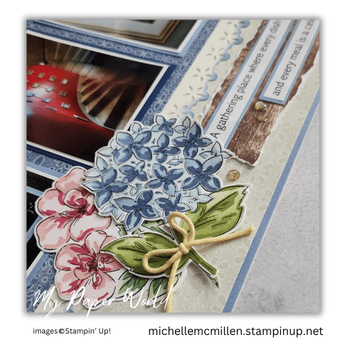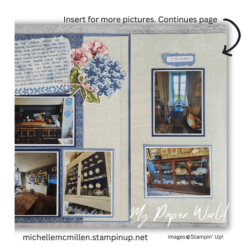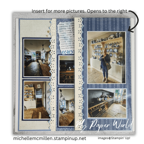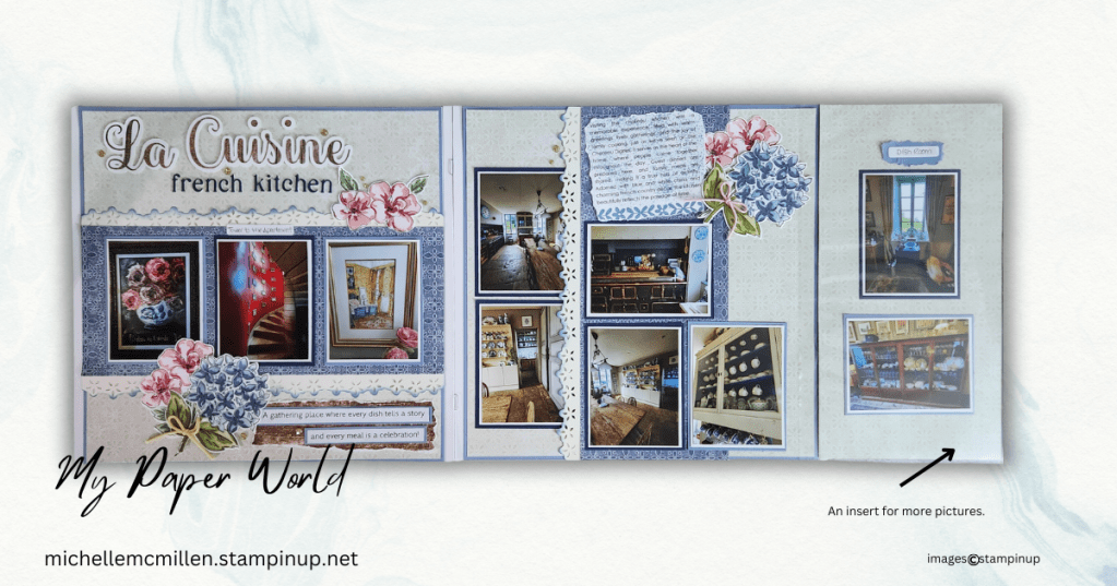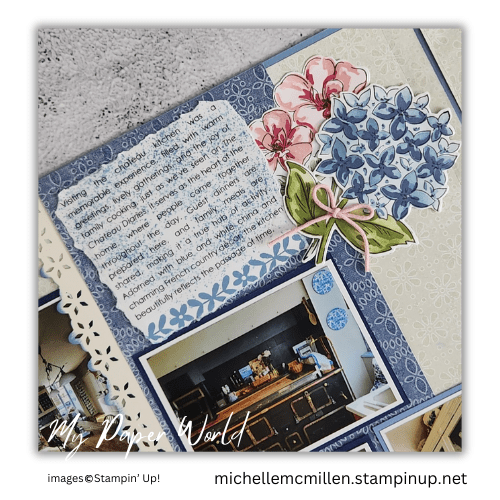 This two-page scrapbook layout was created using the Country Lace DSP, Boho Blue Cardstock, Very Vanilla Cardstock, and Country Woods DSP, carefully chosen to reflect the warm and inviting colors of the chateau kitchen. I wanted the background to echo the blues of the Delft china and the wood grain of the table, bringing the essence of the space into the design.