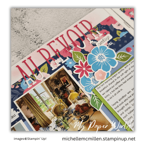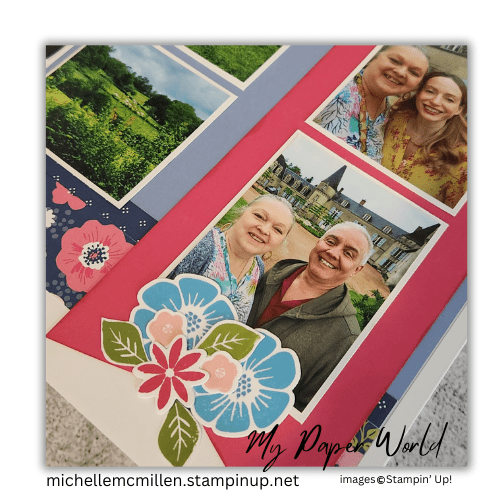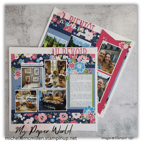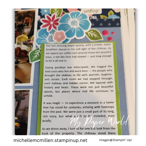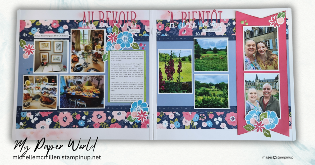 These pages feature the “Flower Shoppe” paper pack from Close to My Heart (retired), which brought just the right mix of floral elegance and gentle vintage tones to complement the theme of our final walk through the Château grounds.