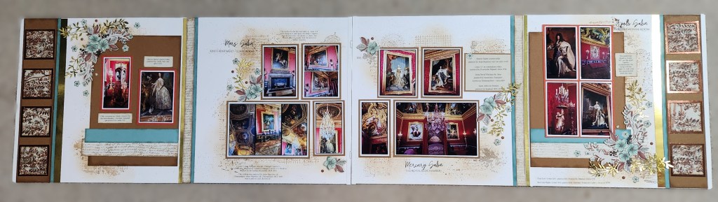 In Part 2, I reveal the four interior pages of my six-page fold-out layout. These pages were designed to feel like walking through the palace itself, moving from one richly decorated room to the next while experiencing the beauty, history, and grandeur of Versailles.